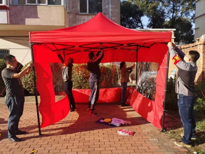 接到檢測(cè)點(diǎn)遷移指令后,支部黨員干部又緊急集結(jié),調(diào)用研究所應(yīng)急帳篷在居民區(qū)空曠場(chǎng)地連夜搭設(shè)核酸檢測(cè)點(diǎn),和下沉黨員一起建立引導(dǎo)區(qū),鋪貼安全線,迅速完成應(yīng)急設(shè)備的安裝調(diào)試,保證核酸檢測(cè)工作順利進(jìn)行。為避免帳篷被大風(fēng)翻卷,物資受損,室外核酸檢測(cè)點(diǎn)每日都要重新搭建。為了讓社區(qū)工作人員充分休息,支部黨員和志愿者凌晨5時(shí)前到崗,確保各項(xiàng)準(zhǔn)備工作在5時(shí)40分前就緒。每次檢測(cè)結(jié)束,他們又將全部設(shè)備設(shè)施收集整理,運(yùn)回倉(cāng)庫(kù)妥善保管。