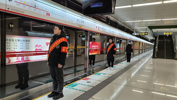 青年志愿者來(lái)到哈爾濱地鐵“理工大學(xué)站”開(kāi)展了志愿服務(wù),他們身著禮儀綬帶、紅色袖標(biāo)站在地鐵站的出入口、售票機(jī)、閘機(jī)口、上下站等位置,為乘客提供指引、咨詢、購(gòu)票等一系列乘車服務(wù),并開(kāi)展了站內(nèi)地面、墻面清潔工作。