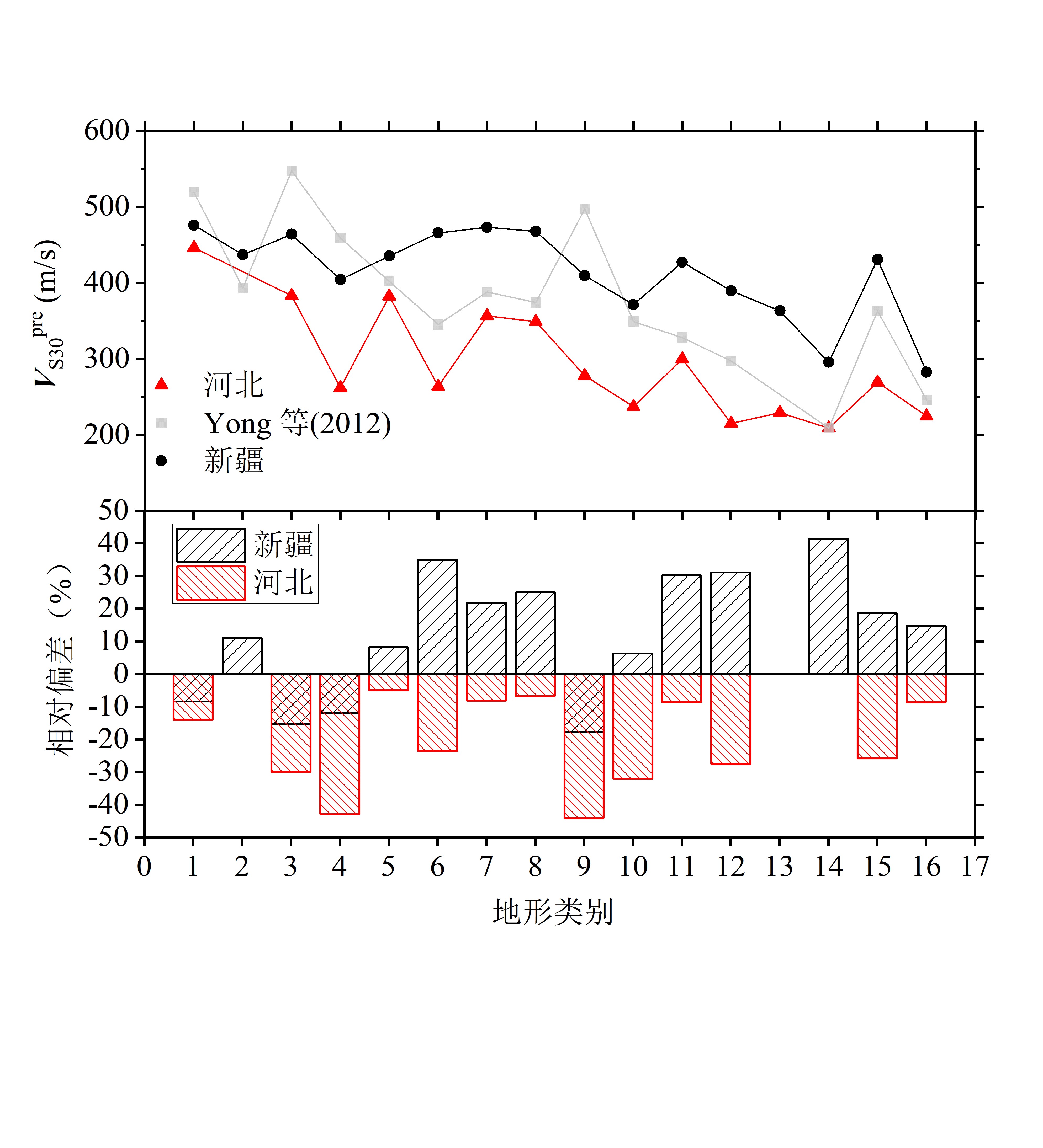 圖2 新疆與河北地區(qū)16個(gè)地形類別的VS30最佳預(yù)測(cè)值及與Yong等(2012)結(jié)果的比較