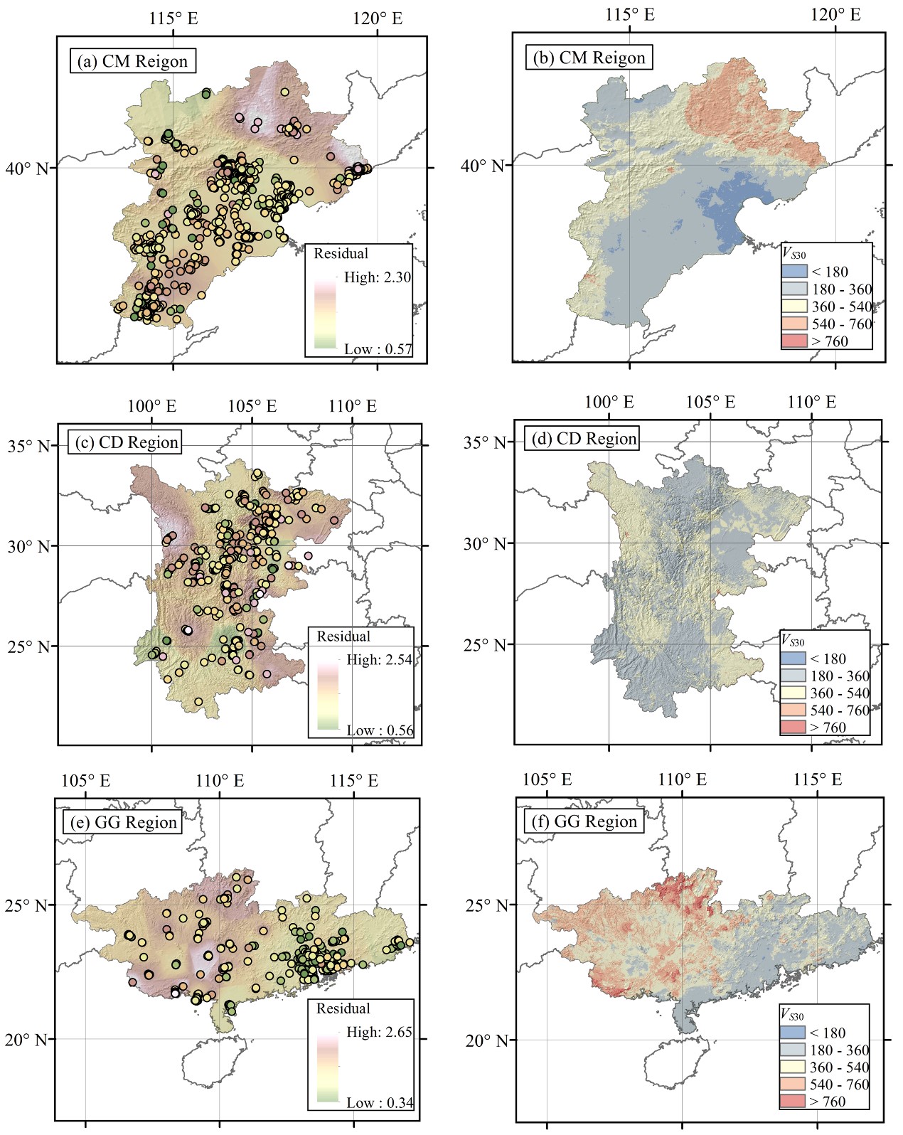 圖4首都圈、川滇及兩廣地區(qū)殘差的空間變化趨勢(shì)及更新后的區(qū)域VS30預(yù)測(cè)結(jié)果