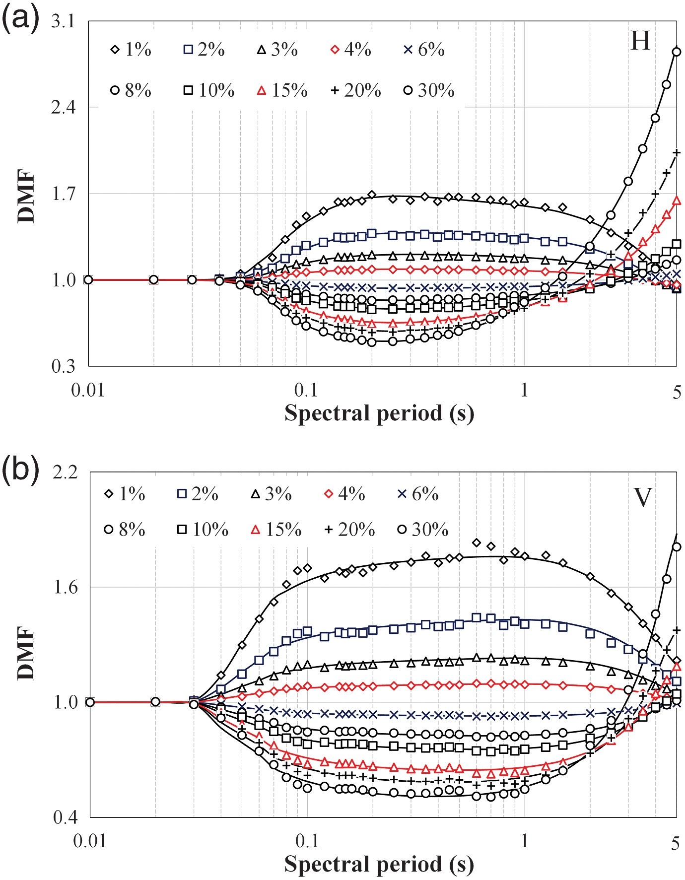 (1)海域和陸域地震動的DMF在大多數譜周期內,海域和陸域地震動的DMF差異顯著,場地條件對海域DMF的影響很小。在較短的周期內,海域模型小于陸上模型;水平分量的海域模型在長周期高阻尼比時比陸域模型大。