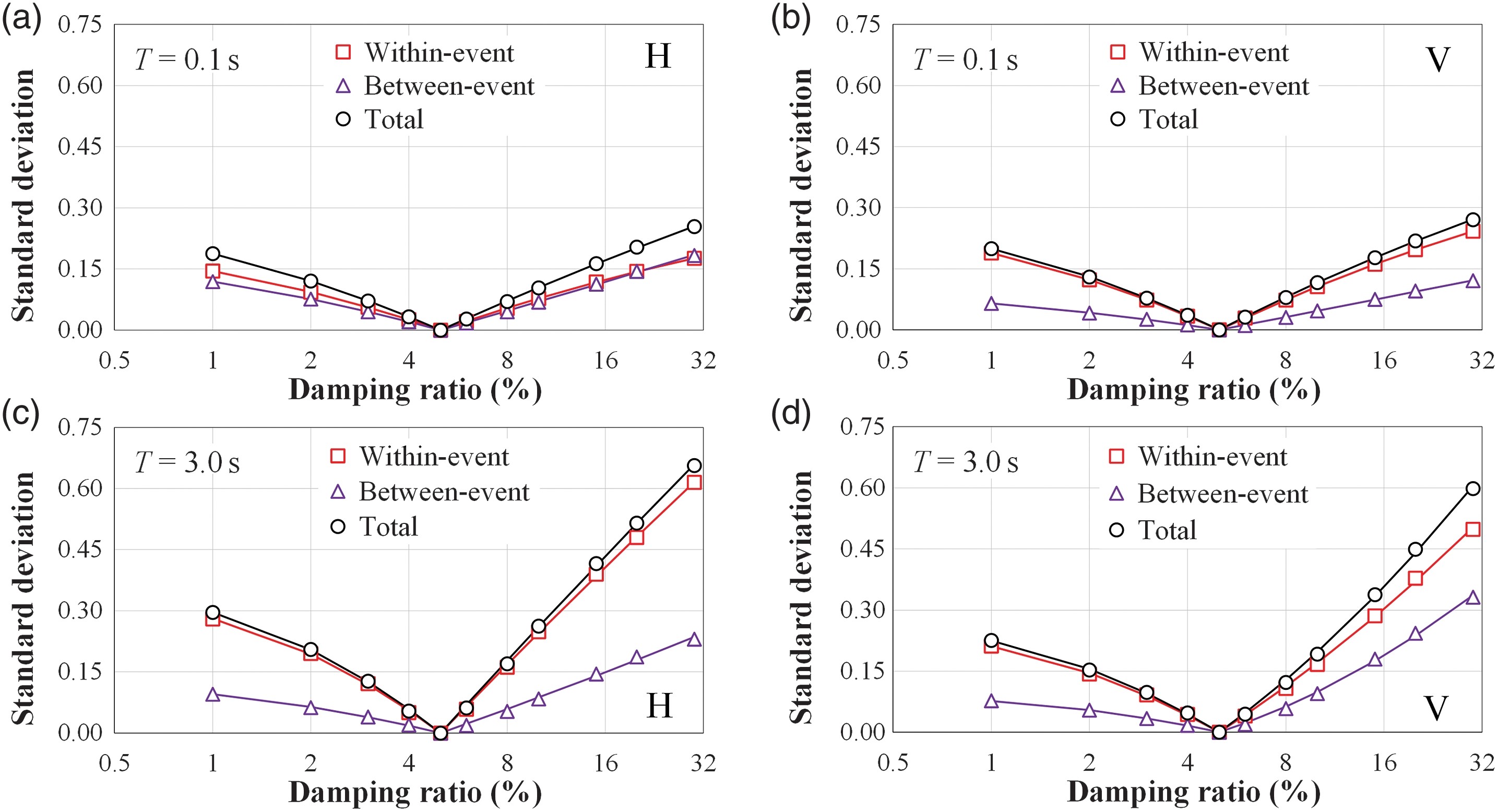 (4)阻尼比為1%時的所有標準差都小于阻尼比為30%時的標準差。總標準差與事件內標準差接近,表明DMF模型的不確定性主要取決于震源效應以外的效應。豎向DMF的標準差略小于水平向DMF的標準差。