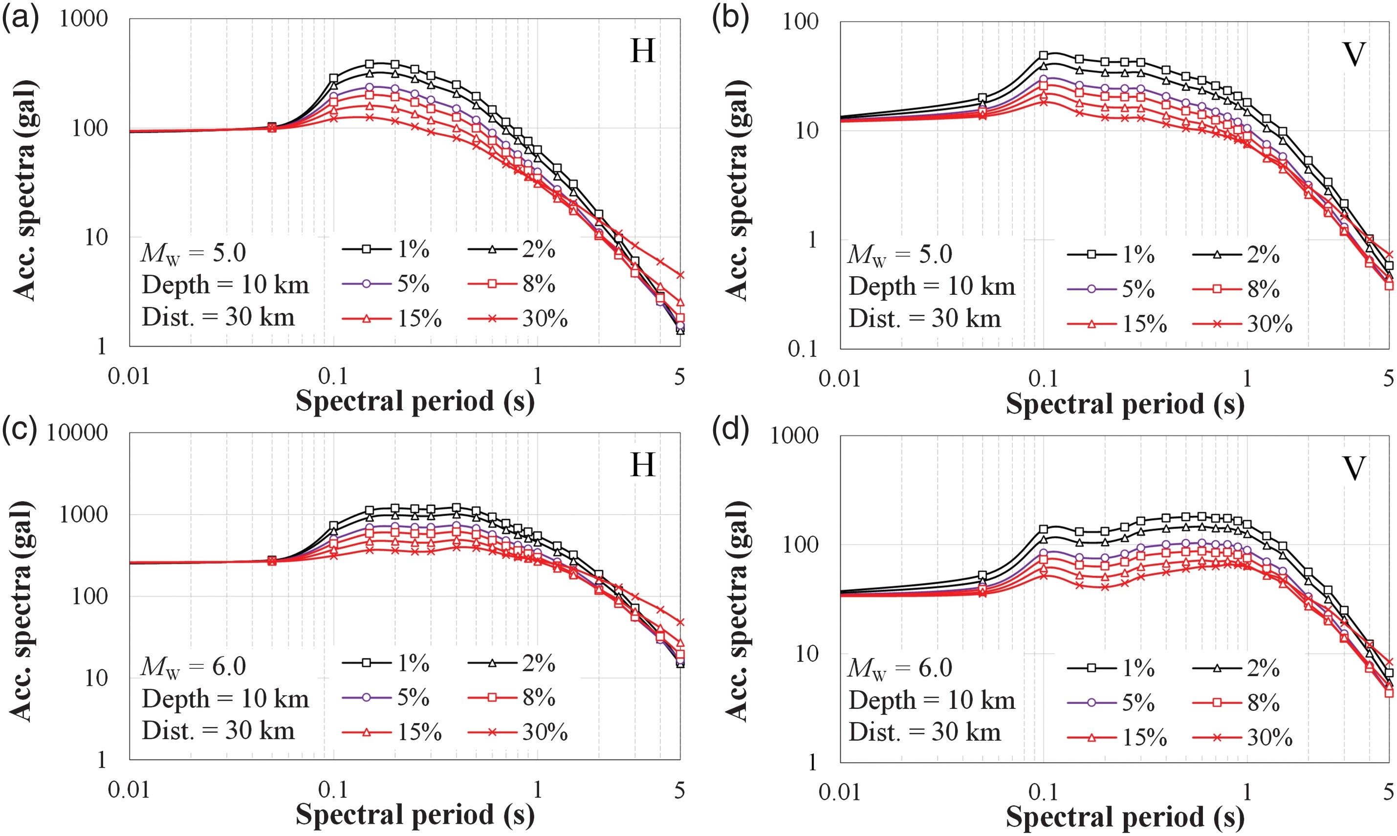 (5)所提出的DMF模型可用于將海域GMPEs從5%的阻尼比縮放到1%~30%的其他阻尼比下的反應譜。由于5%阻尼比反應譜在0.3 s左右出現波谷,調整后的反應譜同樣出現小波谷(如圖4所示)。