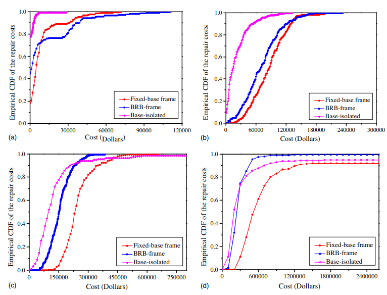 依據(jù)FEMA P-58抗震性能評估理論,選擇基于強度的評估方法,對比了普通框架結構、BRB-框架結構、隔震框架結構在四個地震動強度下的結構響應情況及地震性能評估與損失進行了對比評估。