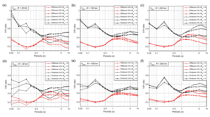 2)為了深入分析海/陸地震動(dòng)輸入能量在水平與豎向的差異,分析了海底V/H輸入能量譜比,并與陸地地震動(dòng)比較。結(jié)果表明,海底V/H輸入能量譜比與陸域譜比在震級(jí)、距離和周期等方面都存在較大差異,海底地震動(dòng)的V/H輸入能量譜比在短周期均明顯小于陸地地震動(dòng),同時(shí)海底臺(tái)站間的V/H輸入能量譜比也存在較大的差異(見圖3)。